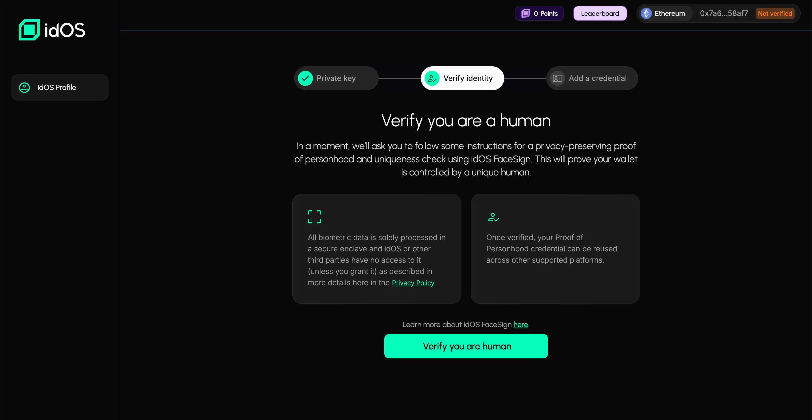 To create your idOS Profile in the idOS App, you have to prove you are a unique human. Therefore, the app will ask you to complete a basic video liveness check. Privacy is very important for idOS, so you can rest assured that biometric identifiable data (i.e. pictures) are never processed outside of secured enclaves, and are never stored anywhere. You can read more about biometrics and idOS FaceSign here.