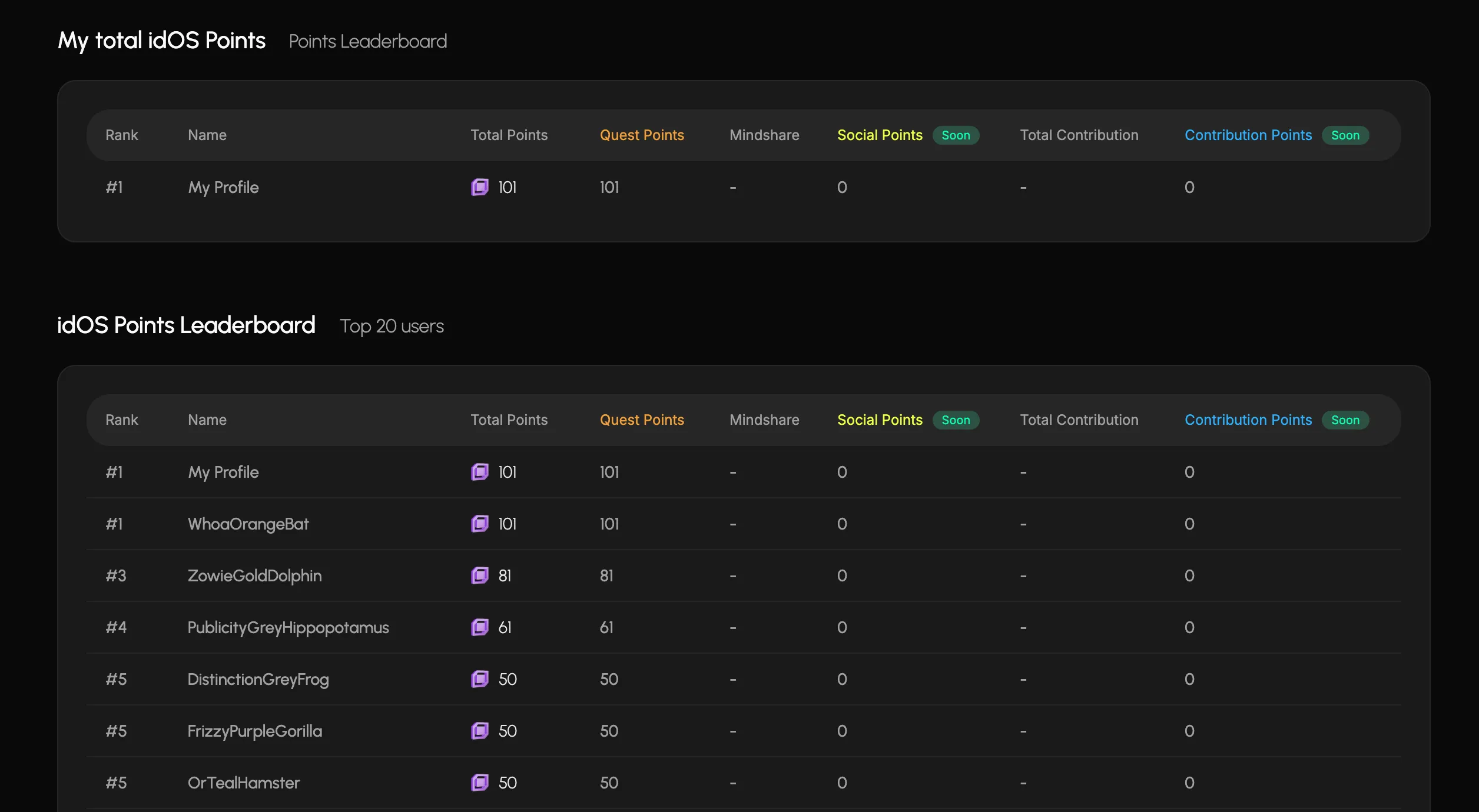 Points measure the engagement and collaboration of community members. Quests are designed to help users experience, research and learn more about idOS.